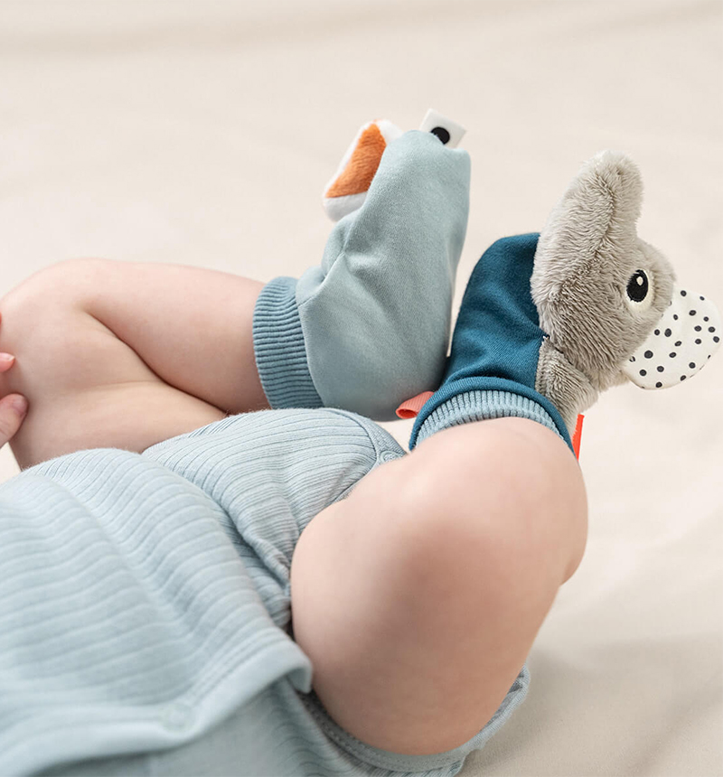 Divertits mitjons sonall dissenyats per estimular el moviment i la curiositat del nadó . Ajuden a activar tot el cos i animen el nen a descobrir i assolir els seus propis peus mentre juga.