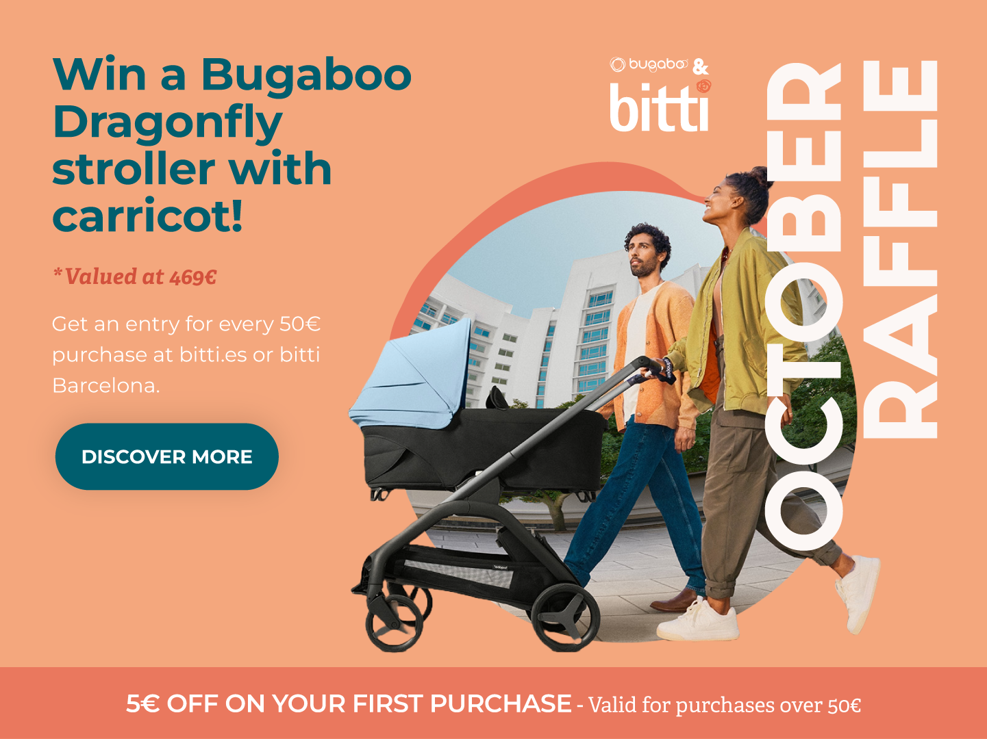 The prize is a Bugaboo Dragonfly stroller with carrycot valued at €1,149.00. The prize is personal and non-transferable. The prize value will only be refunded if the winner purchases a Bugaboo Dragonfly stroller with carrycot during October 2025 from bitti or bitti.es. The prize includes shipping.