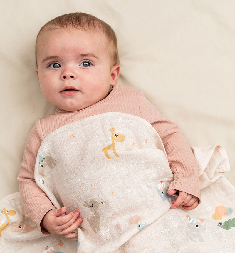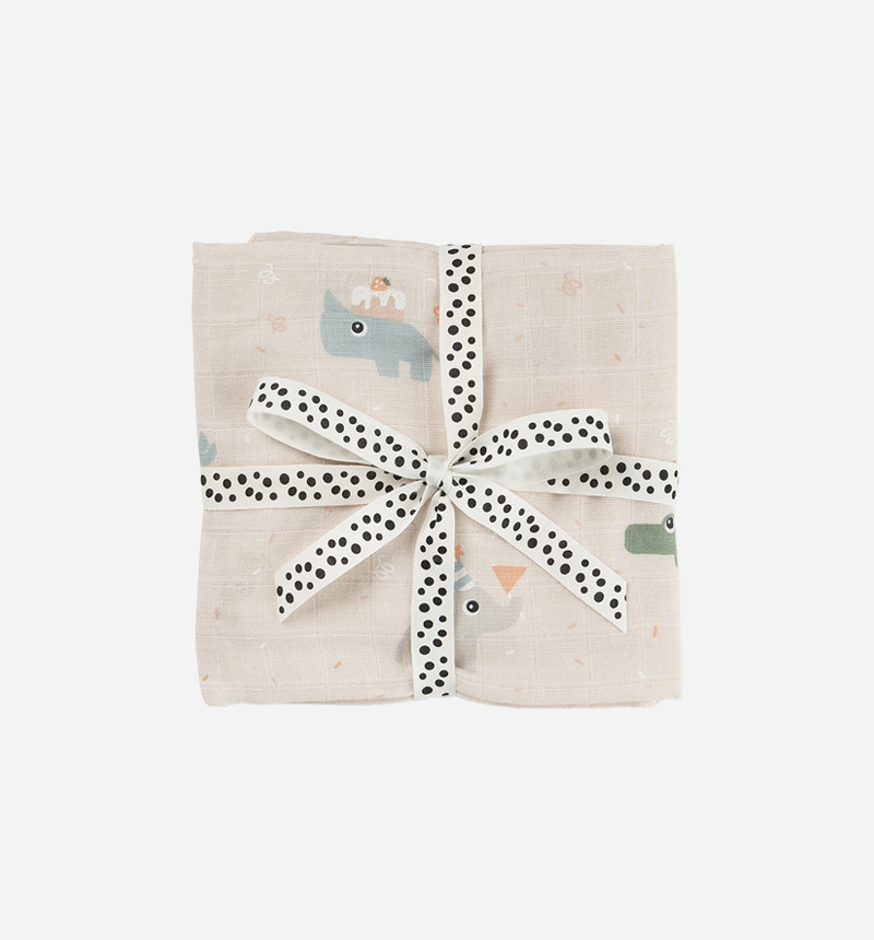 Muselina Celebration de Donebydeer, suave y delicada con la piel del bebé. Confeccionada en muselina de doble capa, transpirable y segura, se presenta envuelta con una cinta, convirtiéndola en un regalo ideal.