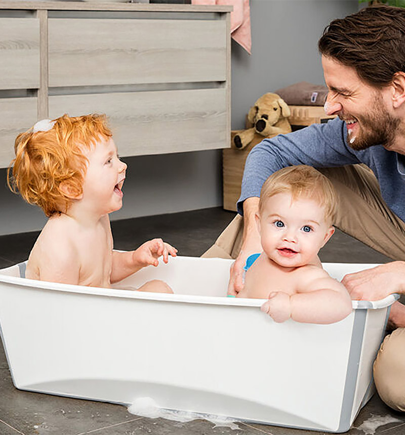 Bañera de plástico resistente, ligero de Stokke que se pliega de manera compacta con un simple movimiento de las manos, junto con un bonito y elegante soporte de Stokke para el baño del bebé que asegura máximo confort y seguridad.