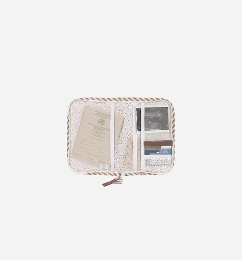 El libro de nacimiento Praliné es una práctica carpeta portadocumentos, ideal para llevar organizada toda la documentación médica del bebé. Su diseño a juego con la bolsa de maternidad permite guardar de forma segura vacunas, recetas y otros documentos importantes.