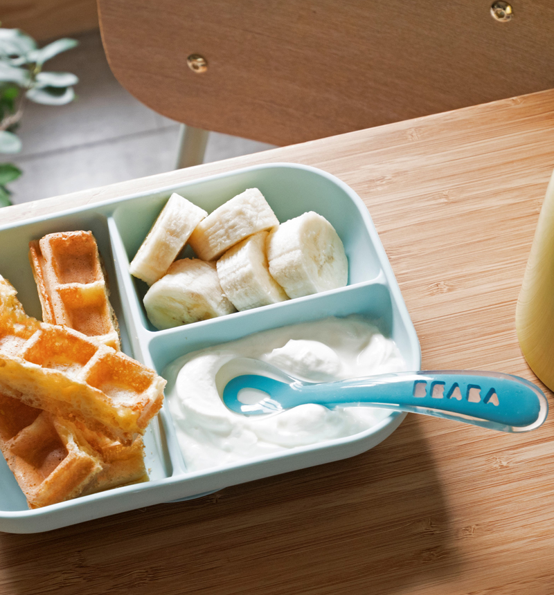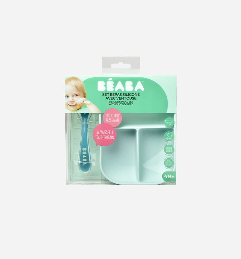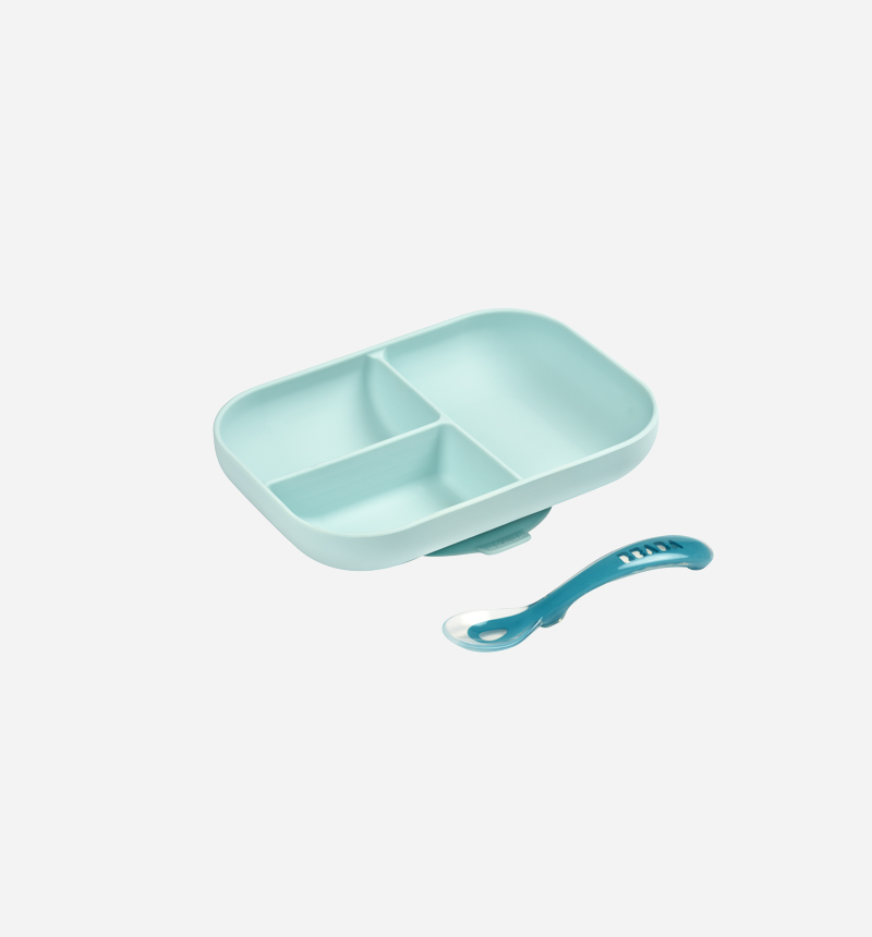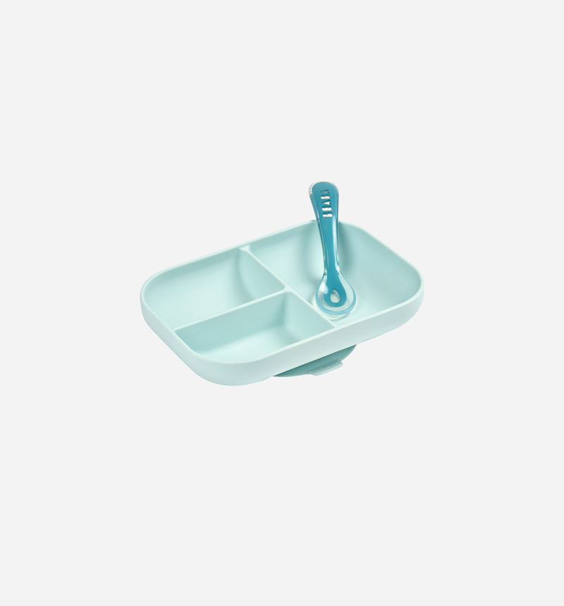 El set comidas de silicona con ventosa de Beaba incluye un plato dividido en 3 secciones para no perder el sabor de los alimentos y una cuchara con forma ergonómica para ayudar al bebé a comer solo.