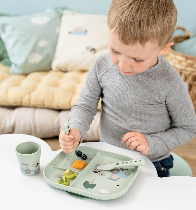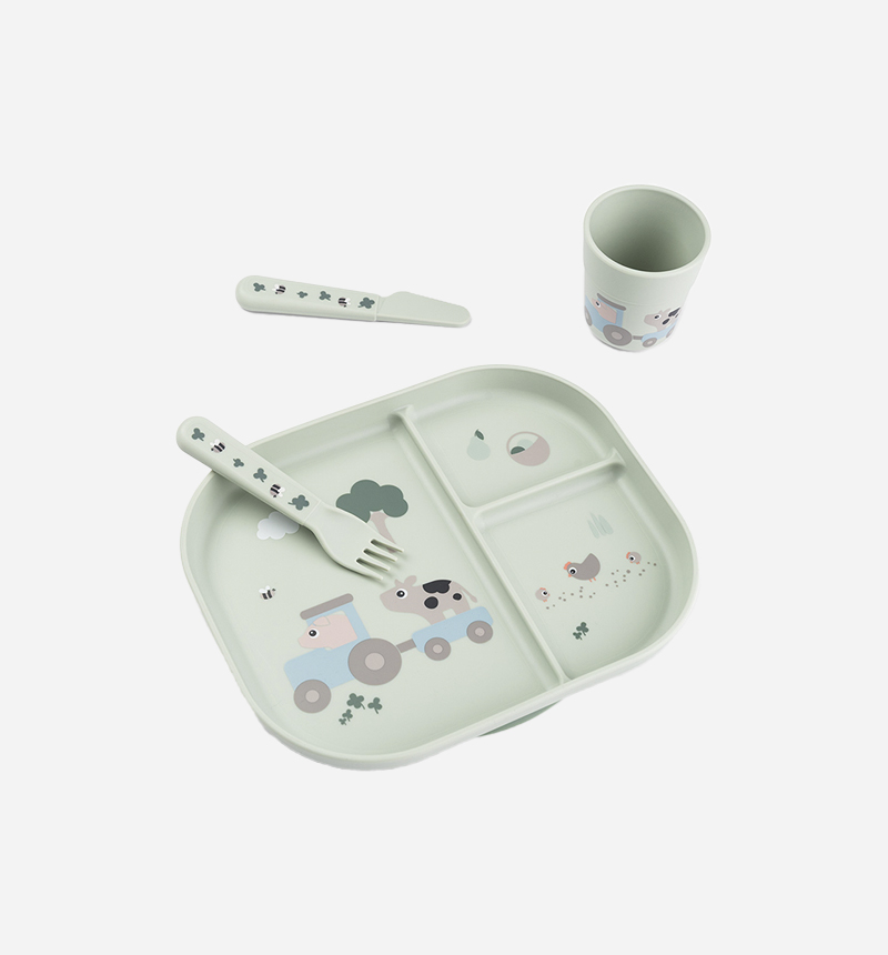 La vajilla Foodie Tiny Farm de Donebydeer está diseñada para hacer de las primeras comidas del bebé una experiencia divertida, práctica y segura. Incluye base con ventosa y un alegre diseño que invita a disfrutar de cada comida.
